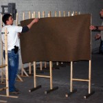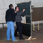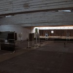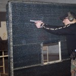 3) «Ларек». В данном упражнении стрелок стоит перед щитом с окном (отверстием) посредине. Оружие заряжено. На разной дистанции перед щитом стоят четыре бумажных мишени скрытые друг от друга и три металлических поппера. Стрелок должен не выходя за пределы ограничительных линий поразить мишени в свободном порядке по мере видимости. Бумажные мишени поражаются двумя выстрелами, металлические считаются поражёнными после их падения.